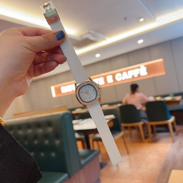 Patek Philippe Aquamarine Series Women's Simple Three-Hand Watch, Affordable Version Now Available! Quartz Movement, Date Display, Embossed Dial, Fully Surface-Type Fonts, Central Seconds Hand, "Tropical" Composite Strap, Aquantaut Folding Clasp, Stainless Steel Model. This is arguably the highest quality women's watch on the market. The watch measures 36mm and is 9mm thick. It exudes an irresistible feminine charm, reflecting women's love for timeless timekeeping.