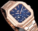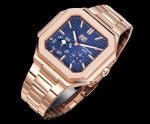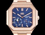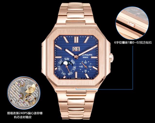 model features a denim strap and a deep blue dial, a classic yet stylish combination of elegance and sophistication. Highlights: True functions include date display, day of the week, and moon phase. Movement: Equipped with a modified 240Ps off-center mini-hammer for stable timekeeping. Strap: Custom denim texture on the dial, calfskin back, folding clasp (original style). A subtle highlight is the 0.02-carat square diamond set at the 6 o'clock position. Sapphire crystal. Case: 45mm in diameter, 11mm thick, the diagonal length from 10 o'clock to 4 o'clock. Due to the near-square shape, the top and bottom widths are smaller than this, resulting in a less visually striking appearance. Welcome to appreciate its beauty.
