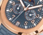 case and bezel feature the iconic rounded octagonal shape, combined with contrasting polished and satin-finished finishes. The grey-blue dial and strap are decorated with an Aquanaut embossed pattern, Arabic numerals, and baton-style hands, all coated with a white luminescent material for easy readability.