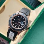 A truly luxurious gold watch has arrived! Completely plated in 18K rose gold! Only 5mm thick. Among the most popular models in the Rolex Yacht-Master series is the 116655-Oysterflex Bracelet, commonly known as the "Gold Yacht-Master." This watch boasts an extremely luxurious design, featuring an 18K rose gold case and a Cerachrom black ceramic bezel, making it highly visually appealing. The 40mm diameter dial includes a Cyclops lens for easy date reading. The brand's patented Oysterflex bracelet features an internal elastic titanium-nickel alloy plate connecting to the case and Oysterlock safety clasp, while the outer layer is coated with high-performance black rubber, providing a superior feel and enhanced comfort. Rolex is known as a "lifetime investment" brand not only for its durability and impressive resale value but also for its industry-leading timekeeping accuracy. This Gold Yacht-Master is equipped with a genuine Swiss Eta-2836 movement and comes with a lifetime warranty! Rolex's classic design and exquisite craftsmanship are highly sought after in the market. The Yacht-Master is a more high-end sports watch, with a domestic retail price as high as 195,130 RMB. Just like its name suggests, the Yacht-Master series evokes a sense of special prestige. An extra rubber strap is included! Ships with full packaging!