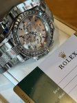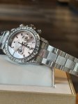 Brand new Rainbow Daytona with diamond-studded strap. Model: 116599Rbow-116598Rbow-116595Rbow. The Rainbow Daytona is extremely rare! It features 36 jewels with optimized color gradients based on the original factory design, ensuring consistent height and angle for a beautiful refraction effect. Each sub-dials on the dial refracts light differently, resulting in vibrant and unique colors. It is equipped with an imported quartz movement and displays the day, month, and 24-hour time. The Rolex steel solid link Oyster bracelet is exquisitely polished.
