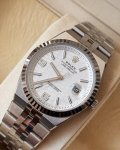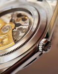 Oyster case has been redesigned, with the upper edge of the middle case and the outer side of the links polished and chamfered simultaneously. The bezel is available with an optional "widened triangular fluted" pattern. It's water-resistant to 100 M, and for the first time, Rolex has used a sapphire crystal case back on a regular sports model, allowing for easy viewing of the high-frequency movement. It features a laser-engraved honeycomb pattern and concentric sunburst design in a double-layered structure; available in ice blue or pure white as the main colors; half-second markers are printed on the beveled flange; and the skeletonized 6 and 9 markers are paired with straight hands for a fresh and stylish look! A blend of technical sophistication and vintage charm.