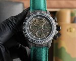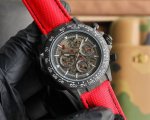The Rolex Universe Daytona series carbon fiber custom edition is not only light to wear but also has a strong appearance. Each watch has a unique carbon fiber pattern. The case size is 40X11.3, which matches the original. The entire case, bezel and bottom cover are made of high-composite carbon fiber. The strap buckle is made of artificial fiber woven belt, which is breathable, comfortable and soft. It is available in green, black and orange. It uses a precise and mature automatic mechanical movement.