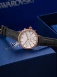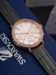 This watch is inspired by the iconic design of Swarovski's Matrix Tennis jewelry collection. It features an elegant 36mm stainless steel case with a rose gold-toned bezel set with 48 transparent crystals. The dial is adorned with guilloch