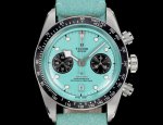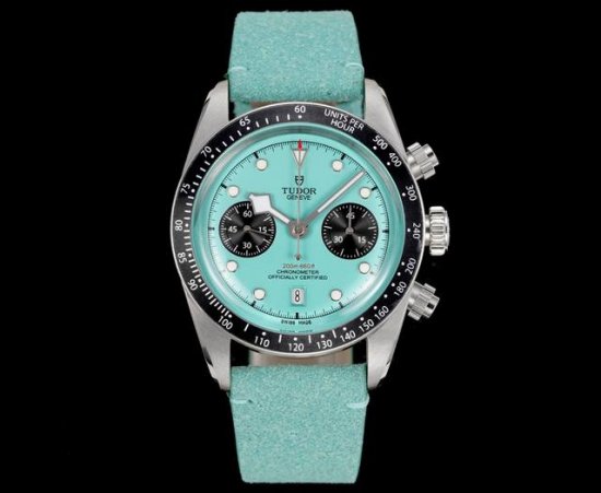 T is a hybrid timepiece that blends diving watch tradition with racing chronograph functions, renowned for its retro aesthetics and modern technology. Here are the main features and model overview of the series: **Design Inspiration and Style:** The dial design is inspired by vintage Tudor diving watches and the iconic "snowflake" hands. The sapphire crystal provides a striking contrast, while also paying homage to the first chronograph, the Oysterdate. **Tachymeter Bezel:** Equipped with a matte black anodized aluminum tachymeter bezel, suitable for racing chronograph functions. **Dial Options:** Available in the latest Jay Chou Pink and Tiffany Blue options. **Case:** A 41mm brushed and polished 316L stainless steel case, water-resistant to 200 meters, suitable for both sports and everyday wear. **Movement:** Powered by the in-house Calibre 7750 automatic movement, COSC certified, featuring a column wheel, vertical clutch system, and silicon hairspring, offering exceptional power reserve and accuracy of -2 to +4 seconds per day. The DDD features a chronograph, date display, and small seconds hand, offering smooth and practical operation. It comes with a dopamine-colored horsehide strap. The Tudor Black Bay Chrono series, with its retro design, high-performance movement, and diverse styles, is a popular choice among chronographs, combining sporty and elegant qualities, making it suitable for watch enthusiasts who appreciate a blend of classic and modern styles.
