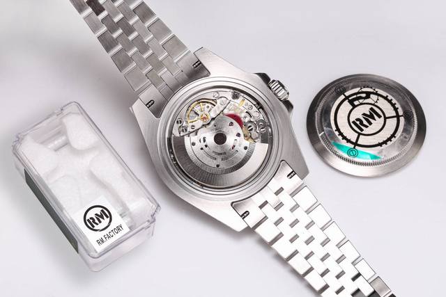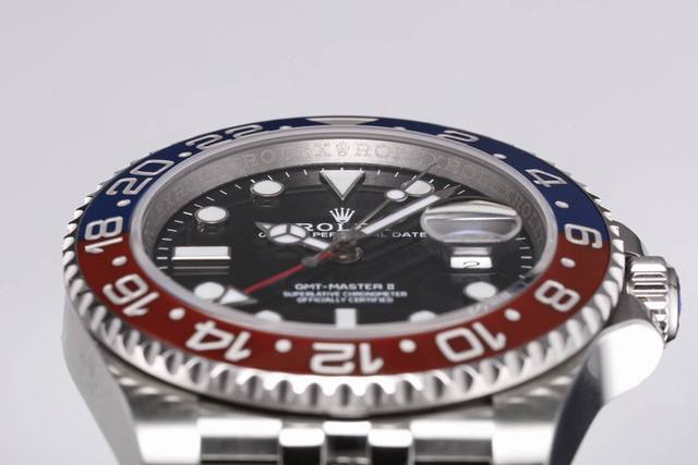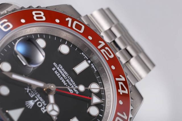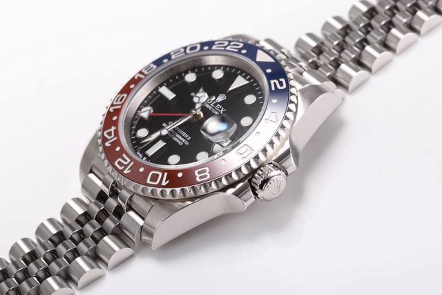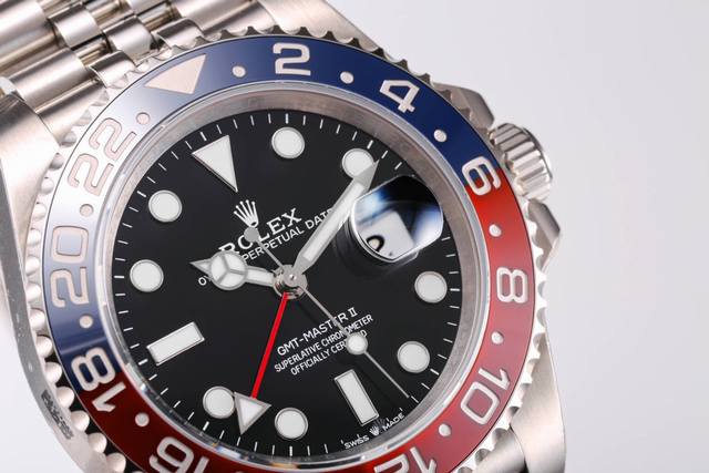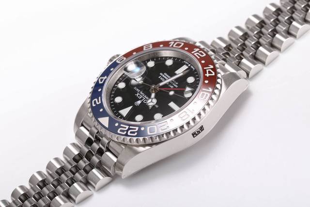 Rmf T GMT-Master II Red and Blue/Black Bezel Upgraded Version. Made with the same 904L steel, featuring a one-piece ceramic bezel using the same hydraulic pressing method. New 3186 integrated movement. Synchronous T-hand for adjusting time and date via forward and reverse adjustment. 40x13mm, 904L steel case and bracelet, sapphire crystal, super luminous, bidirectional ceramic rotating bezel, original folding clasp. Exquisitely recommended men's Swiss mechanical watch, meticulously crafted for you. Highly realistic product photos.